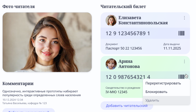 - Читательский билет представляемого. Оформляется на физическое лицо для использования представляемыми физического лица, например, детьми.